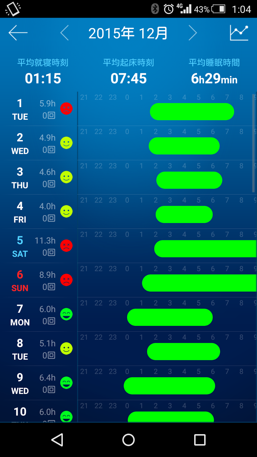 これが非常にいい感じです。今までは、今日は早く起きれたな、とか、しまった寝すぎた、とか何となく把握はしてるつもりでも、一週間、一ヶ月というスパンでの睡眠時間の管理はできてませんでした。熟睡アラームを使って、睡眠を見える化してみると、今週は規則正しい生活ができた、とか、土日寝すぎたなーとかが一目でわかるので、生活リズムを整えるのにはもってこいです。