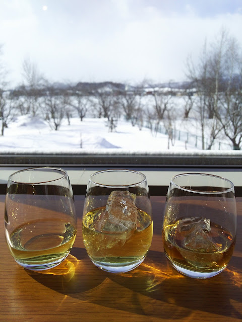 工場見学ツアーの最後には、もちろんお約束の無料試飲が待っています。雪景色を見ながら楽しむウィスキーは、本当に最高です。